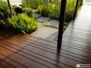 Install for an attractive walway from a refreshing garden into the house for natural beauty wdh a wood grain pattern on a smooth floor with no trace of screws.